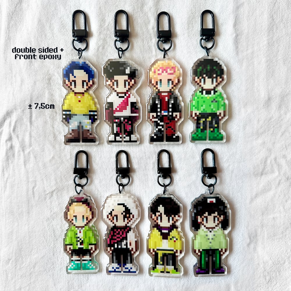 Pixel Stray Kids keychains! They're around 7,5cm/3inches tall, double sided (same design) with one side of epoxy.